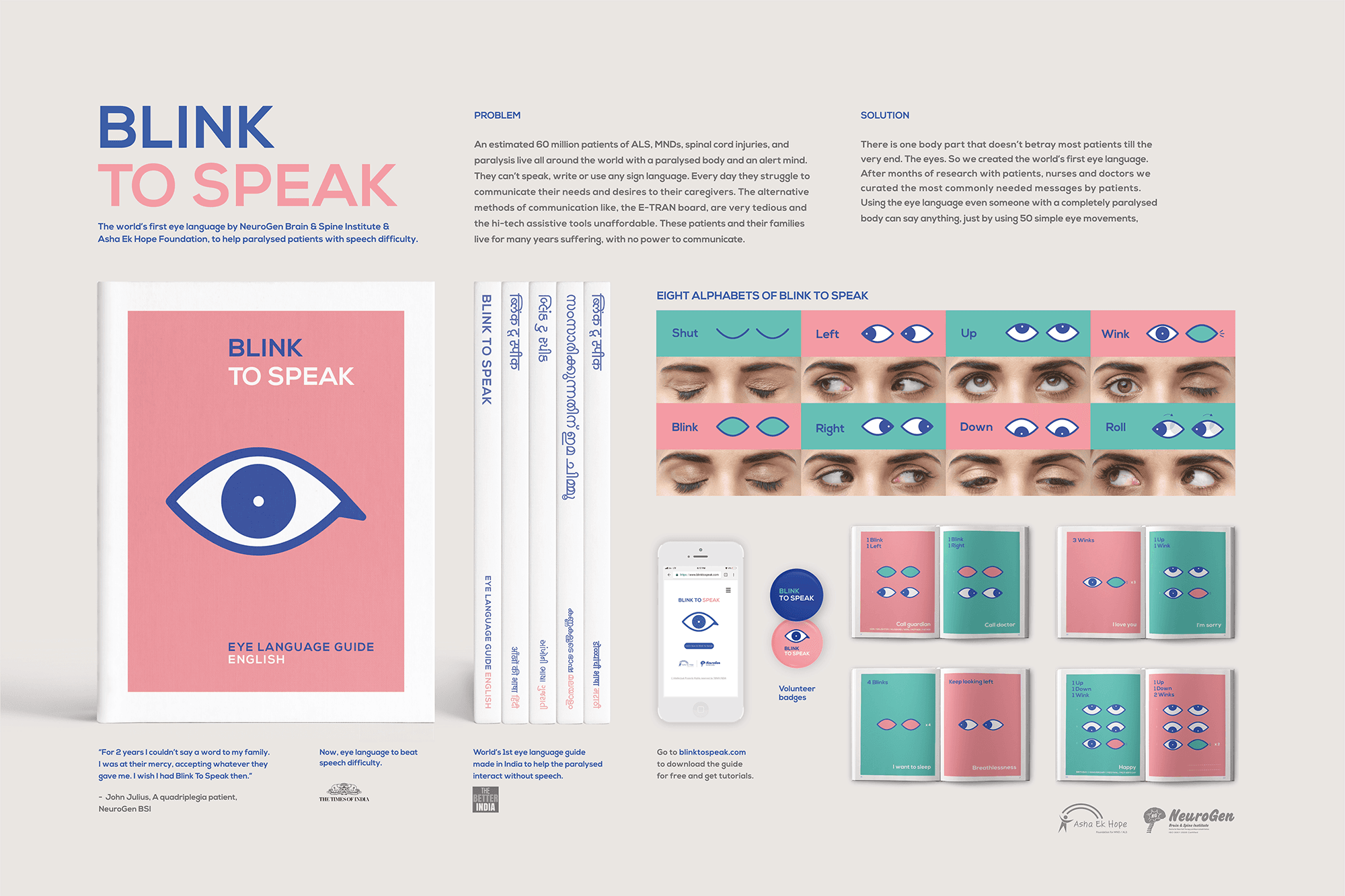 But with a paralysed body there is one part that doesn’t betray most patients till the every end. The eyes. Blink To Speak uses 50 simple eye movements to build an extensive eye language.